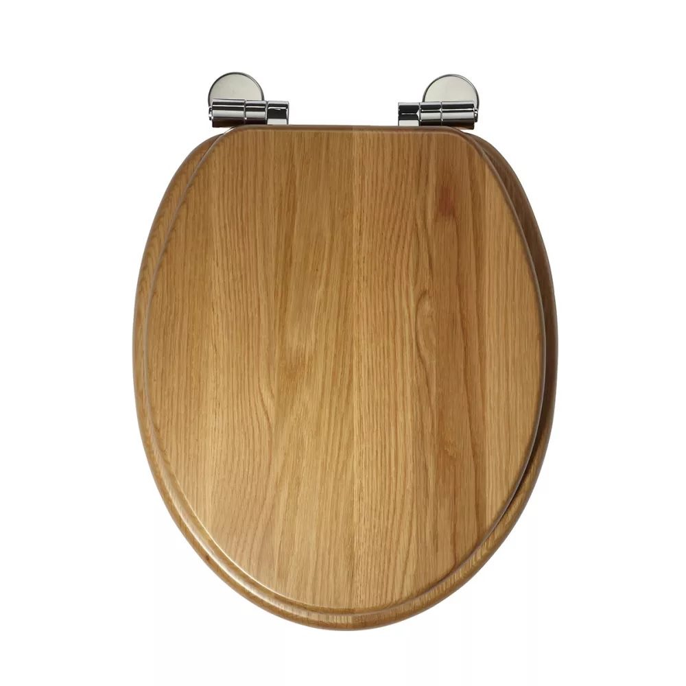 A traditionally sized oak toilet seat with chrome plated soft-closing hydraulic hinges for controlled and quiet closure of seat lid and ring. The traditional oak toilet seat is solid wood construction and has a dowel reinforced seat ring for extra strength. An extremely hard wearing oak toilet seat which has an impact resistant surface.